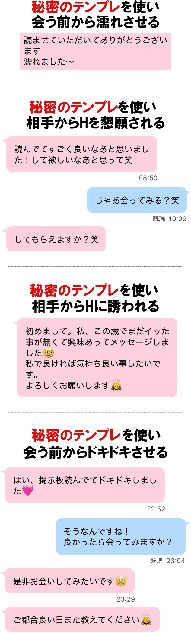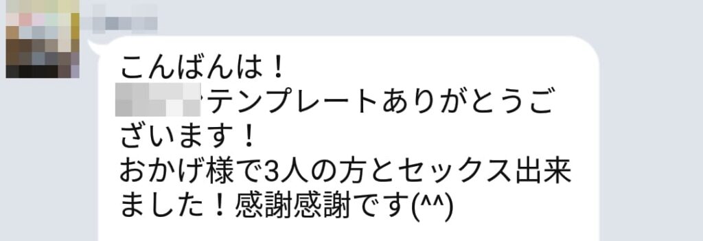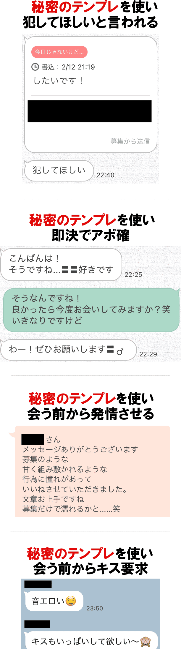 しかし、マスター講座でお伝えする手法なら、テンプレ1つ投稿するだけで相手の感情が高まり、ホテル直行アポが実現しています。(ちなみに相手はこちらの顔を知りません)